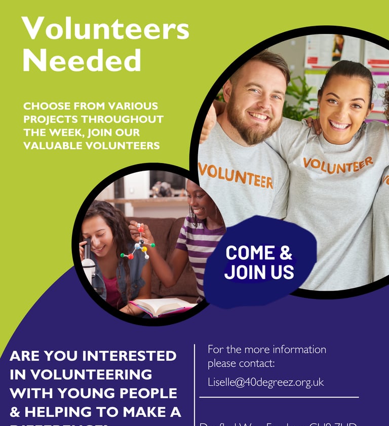 Volunteers are at the heart of what we do. Supporting young people at 40 Degreez is a rewarding experience and a meaningful way to make a real difference in your local community.